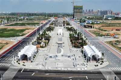 8月4日,银川阅海湾中央商务区,建设中的中阿之轴渐露芳容。据了解,中阿之轴2012年3月以景观、绿化、文化为主题开建,全长2100米,宽90米,每一个景观建筑都彰显出中阿文化特色,预计在今年中阿博览会前开门纳客。(记者 季正 摄)