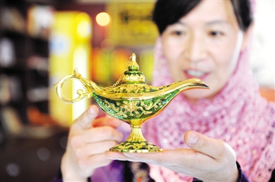 7月30日,在中华回乡文化园,两名来自广东东莞的游客正选购回族服饰留作纪念。目前宁夏正值旅游旺季,旅游景点纷纷推出回乡特色浓郁的旅游纪念品,受到游客的青睐。记者 丁建峰 摄