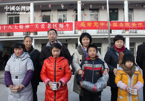 中国台湾网1月6日消息 1月5日,“北京台湾城”28名员工在董事长郭瑞先带领下,冒着数九严寒从北京驱车到位于太行山深处的革命老区阜平县,向该县龙泉关镇小学300余名师生赠送书刊、笔记本和手套,又到骆驼湾村为每家每户送去了崭新的棉被、围巾等过冬物资。西柏坡精神研究会会长王彬生和毛泽东风范词典副主编丁朝真共同参加。
