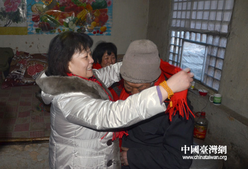 1月5日,“北京台湾城”28名员工在董事长郭瑞先带领下来到阜平县, 为骆驼湾村每家每户送去过冬物资。图为“北京台湾城”董事长郭瑞先为村民带上围巾。(中国台湾网发)