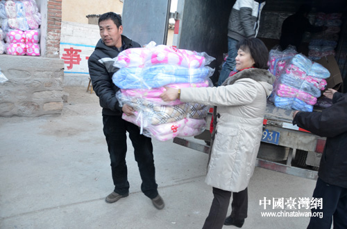 1月5日,“北京台湾城”28名员工在董事长郭瑞先带领下来到阜平县, 为骆驼湾村每家每户送去过冬物资。(中国台湾网发)