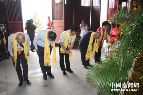 台湾参访团团长严隽泰、中华文化联谊会副秘书长李保宗代表全体人员敬献花篮(中国台湾网 芜同 摄)
