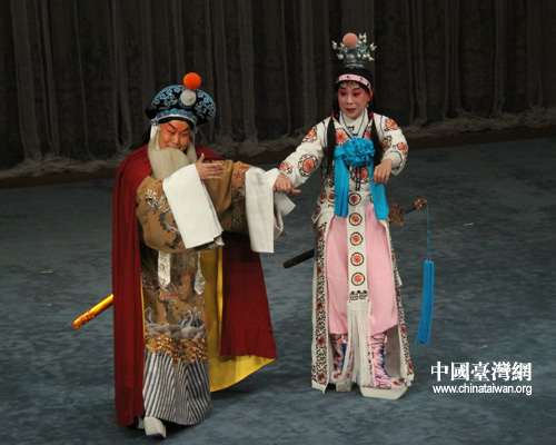 裴艳玲(左)与台湾弟子、著名昆曲小生演员杨汗如深情演绎昆曲《浣纱记·寄子》。(中国台湾网 赵静 摄)