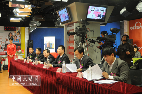 2月25日,由中央文明办主办,中国文明网联合央视网等中央重点新闻网站推出的“百位市长创建文明城市网上谈”大型主题活动启动仪式在央视网举行。出席启动仪式的嘉宾有原中央电视台副总编辑、央视网顾问赵立凡,中央文明办协调组副组长涂更新,中宣部办公厅副主任、中央文明办秘书组组长蒋希伟,成都市委副书记、市长葛红林,中央文明办秘书组副组长、中国文明网执行总编杨武军,央视网副总经理问题(从左至右)。 中国文明网 路弘 摄