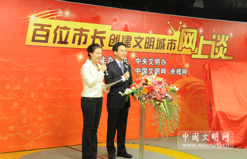 2月25日,由中央文明办主办,中国文明网联合央视网等中央重点新闻网站推出的“百位市长创建文明城市网上谈”大型主题活动启动仪式在央视网举行。 图为启动仪式主持人郎永淳,张莹。 中国文明网 路弘 摄
