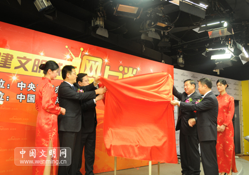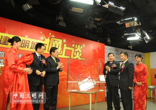 2月25日,由中央文明办主办,中国文明网联合央视网等中央重点新闻网站推出的“百位市长创建文明城市网上谈”大型主题活动启动仪式在央视网举行。 图为到场领导和嘉宾为此次网上谈活动揭牌。 中国文明网 路弘 摄