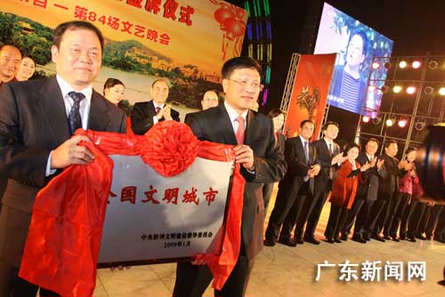 图为惠州市委书记黄业斌与市长李汝求展示惠州获得的全国文明城市金牌。 作者:宋秀杰 吴燕峰 康孝娟