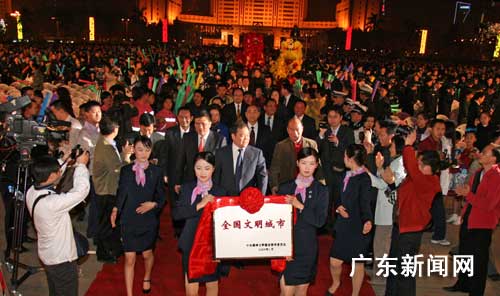 二十日上午全国文明城市颁奖大会在北京召开,惠州市成功获得“全国文明城市”光荣称号,当晚九点到二十一日凌晨,惠州各界举行隆重仪式,欢迎“文明城市”金牌来到惠州。