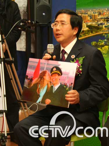 陆善洪:好的。这幅照片的名字叫做“香吻送给邮递员”。这位邮递员的名字叫做姚泽民,他是如皋137条邮路的代表,这张照片是他参加国家邮政局表彰后参观天安门时留下的,当时在他旁边有个外国美女,看到他穿的制服很漂亮就上前和他合影。当时做了短暂的交流以后,外国美女被他是事迹深深地感动就献上了她的香吻。当时这个场景就被同行的记者拍了下来,后来还得了我们市里的摄影一等奖。