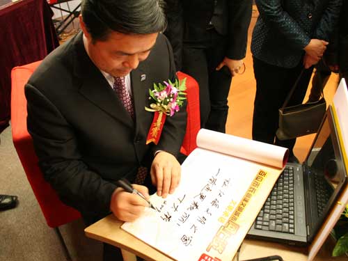 丁大卫:我们再次感谢央视网给我们提供这么好的机会,在这里有一幅照片,是我们苏通大桥的照片,苏通大桥是世界第一桥,有四项世界第一。苏通大桥建成以后,我们就融入了上海的一小时经济圈,我们欢迎各位朋友到南通来,多看看,多走走,也到我们南通来投资实业,热烈欢迎大家。 主持人张莹:好,谢谢丁市长,也请您在我们的文明手册上签下您的文明诺言。