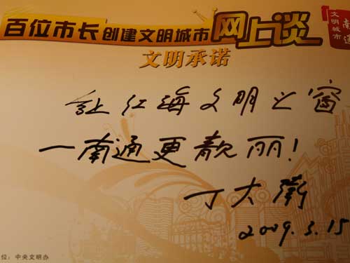 丁市长写下:让江海文明之窗――南通更靓丽!