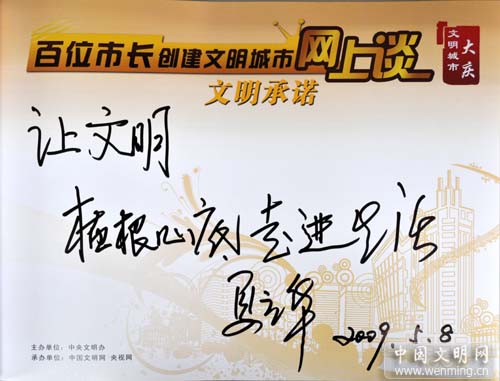 5月8日,黑龙江省大庆市市长夏立华接受中国文明网专访,就大庆市的文明城市创建工作等与网民进行互动交流。当日,由中央文明办主办,中国文明网、央视网承办,新华网协办的“百位市长创建文明城市网上谈”活动举行第十五场,第二批全国文明城市大庆市市长夏立华接受专场访谈。图为大庆市市长夏立华在文明承诺留言册上签下的寄语。中国文明网 胡栋 摄