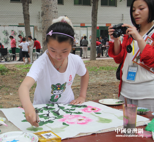 美女记者抓拍小朋友作画。(中国台湾网 罗煜明 摄)