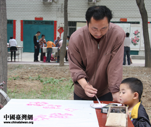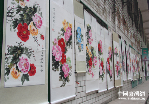 男孩专注父亲作画。(中国台湾网 罗煜明 摄) 牡丹画一字排开。(中国台湾网 罗煜明 摄) 平乐村老人专心作画。(中国台湾网 罗煜明 摄)