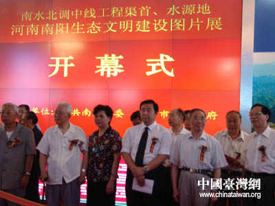 中国台湾网6月25日北京消息 今上午,作为中华民族水源地之一,同时也是南水北调中线工程渠首的河南省南阳市在北京举办了生态文明建设大型图片展的开幕式。国家发改委、水利部、农业部、国家林业局等部委的领导,河南籍在京专家学者,河南省有关单位的领导及各界朋友共200余人出席了开幕式。河南南阳市市长朱广平主持开幕式。