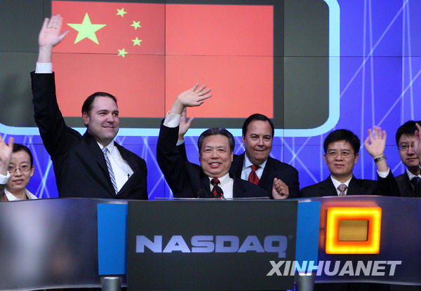 1月26日,在美国纽约纳斯达克总部,中国驻纽约总领事彭克玉(中)出席纳斯达克闭市敲钟仪式。当日,纳斯达克举行特别的闭市敲钟仪式,以庆祝中国农历牛年的到来。新华社记者 侯俊 摄