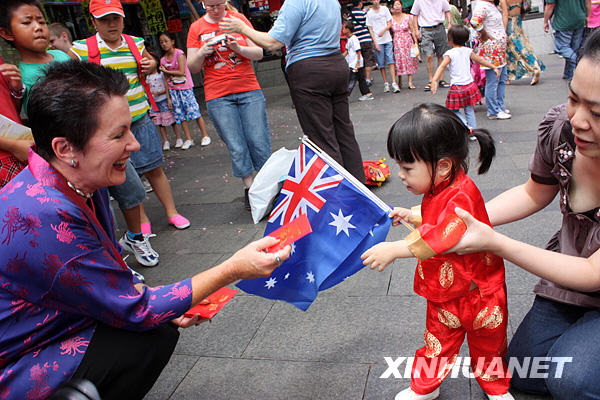 1月26日,澳大利亚悉尼市市长摩雅(左)身着唐装在悉尼唐人街向路人分发红包,分享中国农历新年的快乐。新华社记者江亚平摄