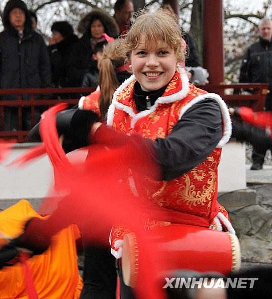 1月24日,在瑞典首都斯德哥尔摩,一名瑞典姑娘跳起欢快的中国腰鼓舞,庆祝中国农历牛年的到来。当天,瑞典东亚博物馆、瑞京华人协会和中国驻瑞典大使馆联合举办迎接中国春节的活动。 新华社记者吴平摄