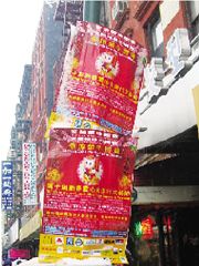纽约华埠街头到处张贴着“新春大游行”和“新春炮竹节”的宣传海报,广为告知着一系列丰富多彩的贺岁节目即将开始。(崔国萁 摄)