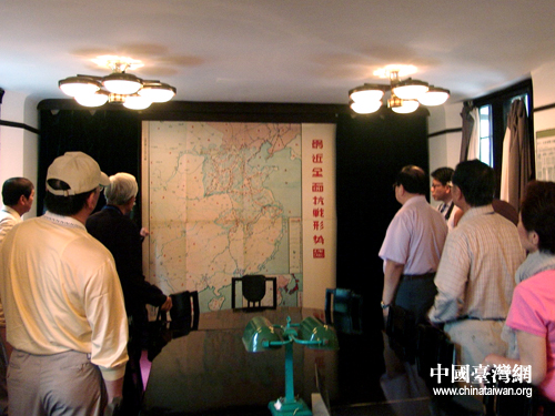 两岸学者在抗战时期蒋介石办公地云岫楼“全面抗战形势图”前驻足观看