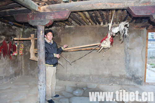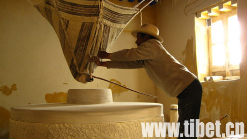 小小不足10平方米的磨房内,静静摆放着一个巨大的石磨,石磨分直径约1.2米的上薄下厚两块,磨盘上方正中吊有盛青稞的底部开口的布袋,布袋上绑着一根细木料与磨盘接触,“刷刷――刷刷――”上面的薄石盘开始转动,青稞就从布袋开口处“嗒嗒嗒~”地落入磨中。