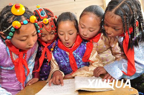 资料图片:3月26日,昌都地区实验小学学生嘎松曲西(中)与同学们一起念课文。新华社记者 何俊昌 摄