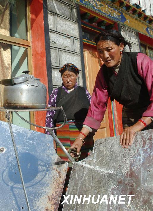 资料图片:2007年12月11日,西藏江孜县达孜乡农民边巴(右)正在用太阳灶烧水。 新华社记者 索朗罗布 摄