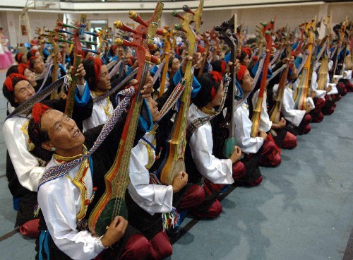 资料图片:在北京参加第三届全国少数民族文艺会演开幕式演出的西藏日喀则地区拉孜县的90位农牧民在排练后藏民间舞蹈“堆谐”(2006年8月28日摄)。新华社记者 唐召明 摄