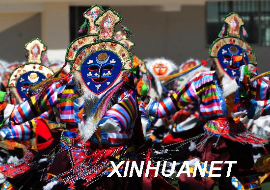 资料图片:2008年4月8日,西藏自治区藏剧团演员在排练藏戏《吉祥奥运》。被列为首批国家级非物质文化遗产保护名录的藏戏,距今已有600多年历史,被誉为“西藏文化的名片”。新华社记者 觉果 摄