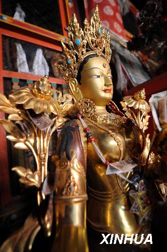 资料图片:这是萨迦寺内重要文物之一——绿度母像(2008年11月28日摄)。国家投资8600万元的西藏萨迦寺维修工程已经完成了近80%,预计2009年将完成全部维修任务。萨迦寺始建于1073年,是藏传佛教萨迦派主寺。新华社记者觉果摄
