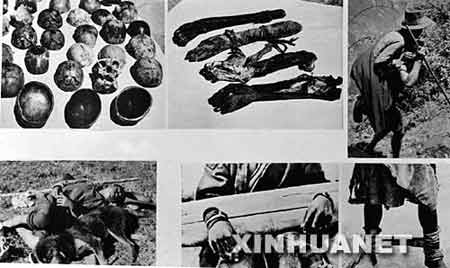 左上:农奴主用被他们残害的劳动人民的头盖骨做成的碗;中上:一些已经风干变黑的被害者的手臂;中下:农奴主摧残农奴和奴隶的刑具;左下:农奴益西亲沛服劳役回来后疲乏不堪,和狗一起席地而卧;右上:农奴主外出时,强迫农奴像牛马一样背着他们走;右下:农奴主摧残农奴和奴隶的刑具。