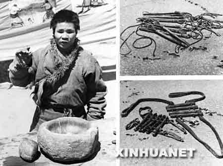 左图为被挖去双眼的农奴格达在民主改革中控诉农奴主的罪行:农奴主将沉重的石帽戴在农奴头上,用石头敲击将眼珠挤压出来,再用利刀把眼珠剜下。右上为鞭笞人的法鞭,右下为夹手指刑具。