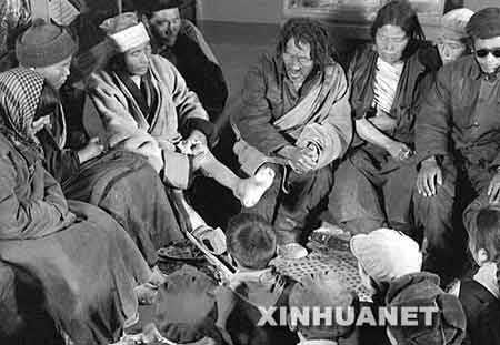 在一次对农奴制度的控诉会上,西藏自治区昂仁县查孜乡牧民协会主任、乡长次登在向人们介绍他的一家在农奴社会里受到的残酷剥削。他11个兄弟姐妹有6个活活被冻死和饿死,有5个被逼得在外逃亡。次登和弟弟纳比因报仇未遂被领主贡布毒打虐待后,又抽掉了脚筋。他的父亲受尽了折磨,最后冻饿而死。 新华社发(资料照片)