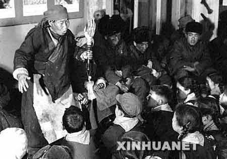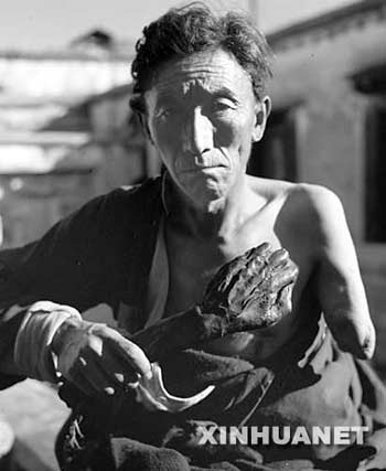 西藏日喀则专区奴隶出身的多扎瓦在控诉吃人的农奴制度。领主的儿子为了玩乐把多扎瓦当作活靶,用枪打断了他的左臂。多扎瓦残废后,被领主赶了出来,带着断了的干枯手臂到处讨饭。民主改革后,医院治好了多扎瓦的伤,他分到了土地、房屋、牲畜和生产工具,过上了安定的生活。 新华社发(资料照片)