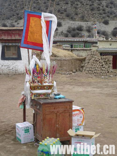 村子广场中间摆放着切玛和经幡旗。 摄影:曲晓丽