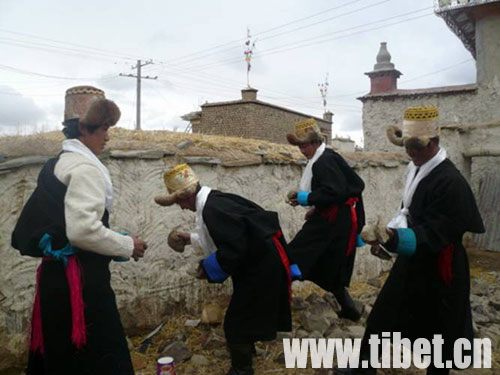 当每个人投掷三次之后,第一轮比赛就结束了。所有的人一阵欢呼,飞跑着来到牛角处捡拾自己心仪的石头,准备继续投入下一轮的战斗。三轮比赛结束之后,四个村都有代表击中牛角,这就预示着在新的一年中,所有的村落都会风调雨顺,吉祥如意。村民们来到广场边,围坐在一起,喝着青稞酒,聊着天,等候着一会儿将要进行的跳“锅庄”活动。