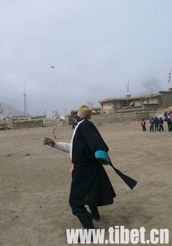 在广场角落的椅子上等待的时候,村民们会向参赛者献上酥油茶,披上哈达,以示祝福。活动正式开始之后,勇士们面朝牛角一字排开,将他们精挑细选的“武器”——石头放在脚下。这时,四五个妇女手捧切玛、青稞酒、酥油茶依次敬献,勇士们分别敬天、敬地、敬人后,开始比赛。 第一个打牛角的是村长,只见他将石头放在嘴边,口里念念有词,意即祈求能够打中。村长投出石头之后,其余的人依次开始打牛角——准备、起跑、投掷,动作一气呵成。有人扔出的石头太近或者太偏了,人群中就会发出戏谑的哄笑声,投掷者会害羞地跑回队伍中;当石头打中一个或者两个牛角之后,人群中响起一片欢呼,村民们开始向投中的勇士敬酒、献哈达,表示祝贺。接着,村民会重新将牛角摆上,准备好下一次的投掷。