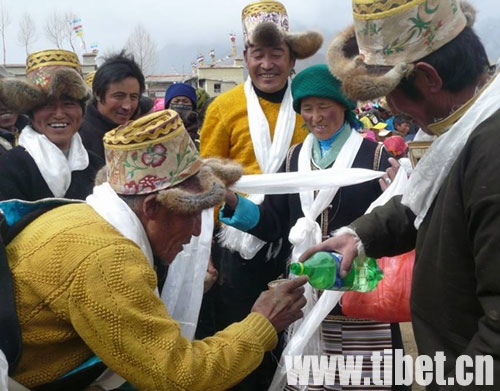 为打中牛角的勇士敬饮料,献哈达,表示祝贺。 摄影:曲晓丽