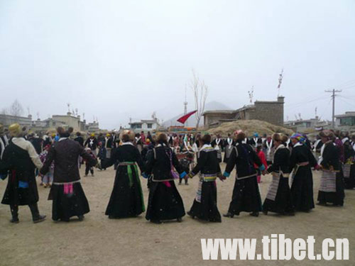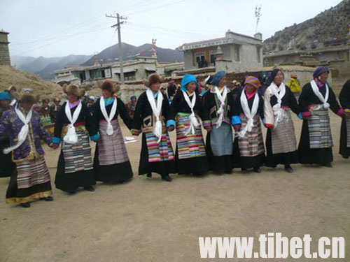 经过短暂的休息,村民们开始往广场中间聚集,围绕着摆放切玛的桌子,男女拉手成圈各站一边,开始跳“锅庄”。男性带头启唱,歌声嘹亮,穿透力极强,人群和着歌曲,甩手踏步,沿圈走动。当唱词告一段落后,众人一齐“哑”的一声呼叫,顿时加快速度,挥舞双袖,载歌载舞。男性伸展双臂,有如雄鹰盘旋奋飞,女性点步转圈,有如凤凰摇翅飞舞。就这样,他们会边跳锅庄,边喝青稞酒,直至夜幕降临。夜幕降临时分,“锅庄”内会燃起熊熊篝火,整个庆祝活动达到高潮。
