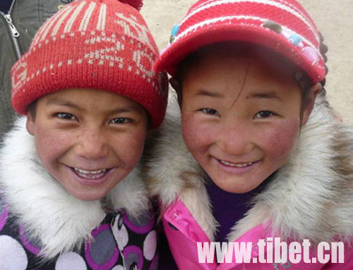 两个藏族小姑娘在村中广场玩耍。 摄影:曲晓丽