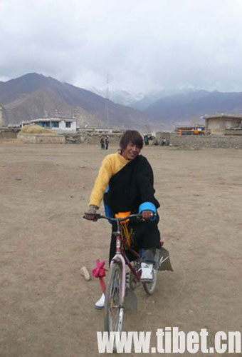 骑着自行车的藏族小伙子来到村中广场。 摄影:曲晓丽