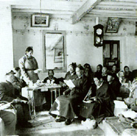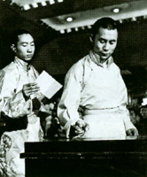 1954年,十世达赖和十世班禅赴京参加全国第届人民代表大会,达赖喇嘛当选人大副委员长,班禅当选为人大常委。这是他们在人民大会堂参加投票选举。