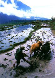 二牛抬杠的耕作方法一直沿袭到20世纪中叶,在一些偏僻乡村至今也能偶尔见到这种古老的耕作方祛。在20世纪80年代以后,以手扶拖拉机为主的新型农业机械和农用动力普遍代替了传统的牛力、人力。农业机械化、电气化、化学化、水利化、良种化及精耕细作化水平逐渐提高,给西藏农业传统注入了现代化活力。到1997年时,西藏农业机械总动力达77.45万千瓦,农村用电量1929万千瓦/小时,农用化肥施用折纯量2.44万吨,农田有效灌溉面积156.74千公顷,西藏农牧业发展基础设施已得到较好的改善。1988年以来,农业连年获得丰收,1997年粮食总产量达79万吨,1998年达85万吨。2001年,西藏粮食产量达98.25万吨,连续夺得了14个丰收年,为1959年的5.5倍,再创历史新高。2002年,全区农机化工程势头良好,全区机耕、机播、机收面积分别达11.6万公顷、14.6万公顷、8.4万公顷,为西藏下一步的农业发展打下了良好的基础。