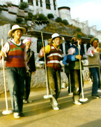 在西藏又苦又累的打夯场,你同时也可以看到载歌载舞的场面。藏族人喜欢快乐地劳动,有音乐、歌声伴奏的劳动。边歌边舞边劳动,是西藏独特的劳动景观。有些劳动过程甚至配有相应的劳动号子。如流传于藏北民间的《达普号子》中唱到: