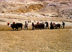 农民在春耕之前仍依传统择吉祥日举办仪式。在这一天的上午,男人们赶着饰有红缨和哈达的耕牛,驾驶着拖拉机,妇女和儿童端着“切玛”,背上香草,提着青稞酒,身着盛装,聚集在村边平坦的耕地上,村里老人在地中央起“桑”,祝福新的一年获得好收成。犁手们用糌粑和青棵酒敬“三宝”(佛教将佛、法、僧称为三宝)在接受大家的祝福之后,犁手们赶着耕畜开犁,妇女们围着香烟缭绕的“桑”载歌载舞。春耕仪式标志着春耕生产拉开了序幕。春耕仪式是古老的,但拖拉机的介入使古老之中附带着现代气息。同时,透过这种独特的农事活动仪式和严肃活泼的场面,也能够感受到一种民族性格和生活态度。