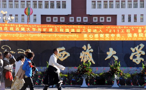 资料图片:2008年12月16日,几名西藏大学学生从新校区大门前走过。新华社记者 格桑达瓦 摄