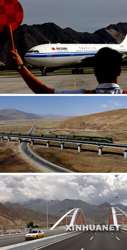 资料图片:自2006年7月火车通至拉萨以来,打破了西藏自治区的交通瓶颈,使得铁路、公路以及航空运输的立体交通格局凸现于“世界屋脊”。上图为一架飞机降落在拉萨贡嘎机场(2006年7月18日摄)。 中图为一列火车行驶在藏北当雄县境内的青藏铁路与青藏公路立交处(2007年4月13日摄)。 下图为拉萨柳梧立交桥一角(2007年6月28日摄)。 新华社记者 觉果 摄