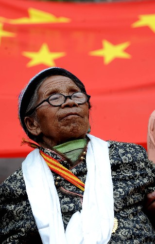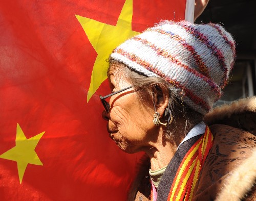 4月4日,老阿妈次仁曲珍参加迎接国旗的仪式。 新华社记者 索朗罗布 摄