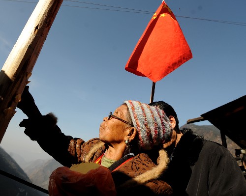 迎着朝阳,次仁曲珍老阿妈在村民的帮助下吃力地把国旗在院子里升起。老人缓缓抬头,仰望着这面在晨风中舒展开来的五星红旗。