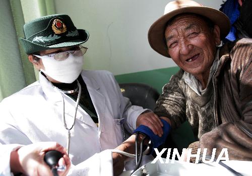 资料图片:3月23日,武警西藏总队医院医生为一位藏族老阿爸量血压。新华社发(钱檬 摄)
